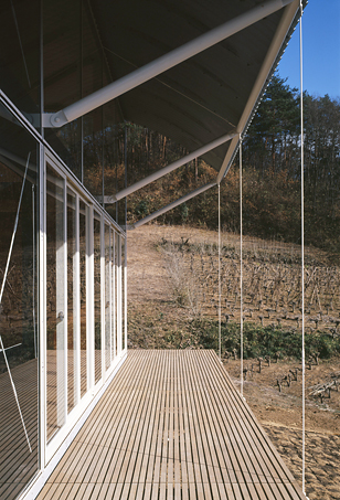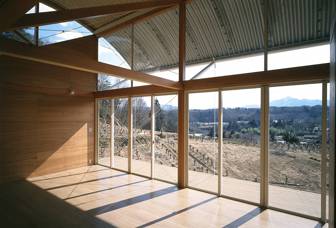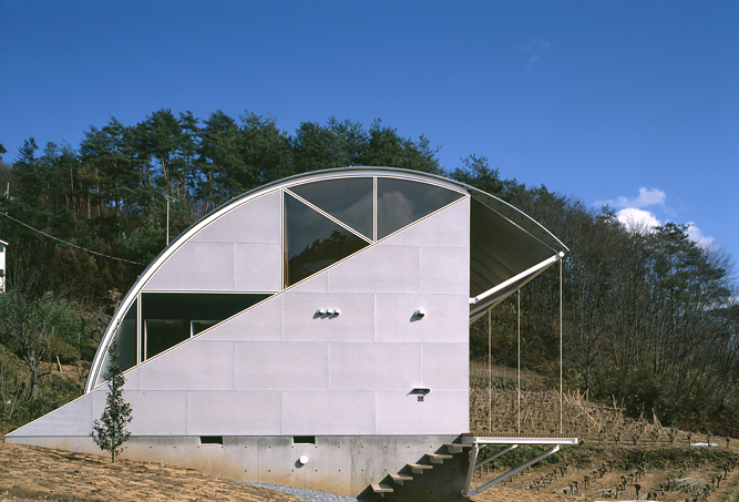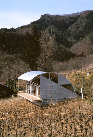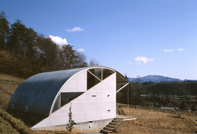 埼玉県秩父の緑豊かな田園の中に建つ個人住宅です。南側に緩やかに傾斜し、山々などの自然風景に囲まれた見晴らしのよい都心では味わえないなんともきれいな空気に包まれています。特徴的な屋根はアールに加工したコルゲート板をすっぽりと被せた構造です。この材料は厚さ2.7mmの被膜自体が構造体として自立しているため、4方の軸組で支えられている以外は補強材の必要はなく、すっきりとした空間を可能にしました。