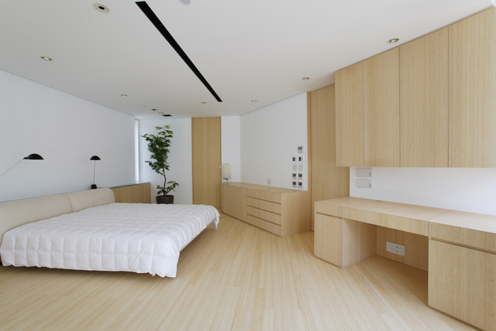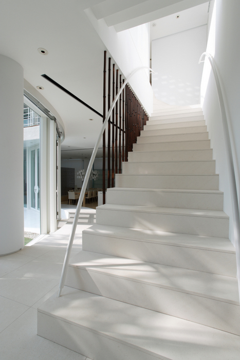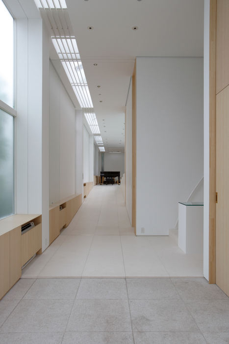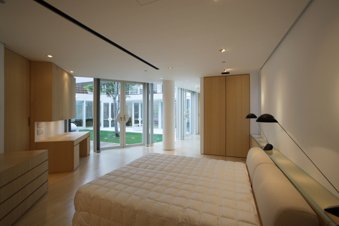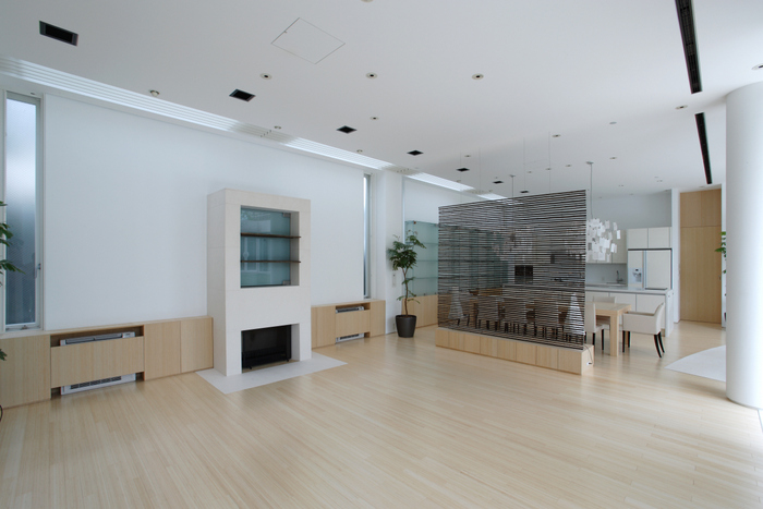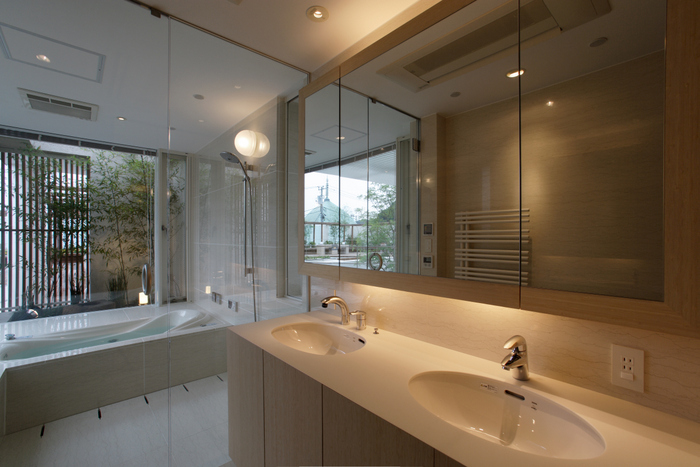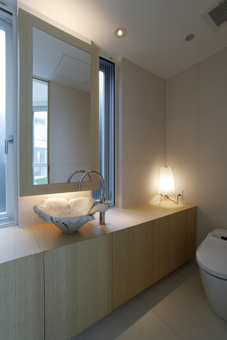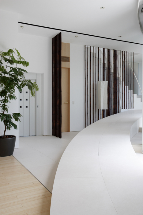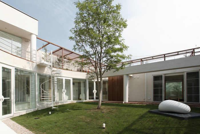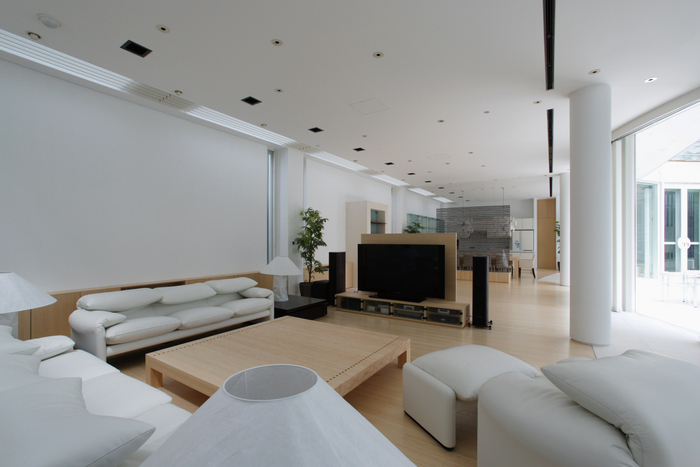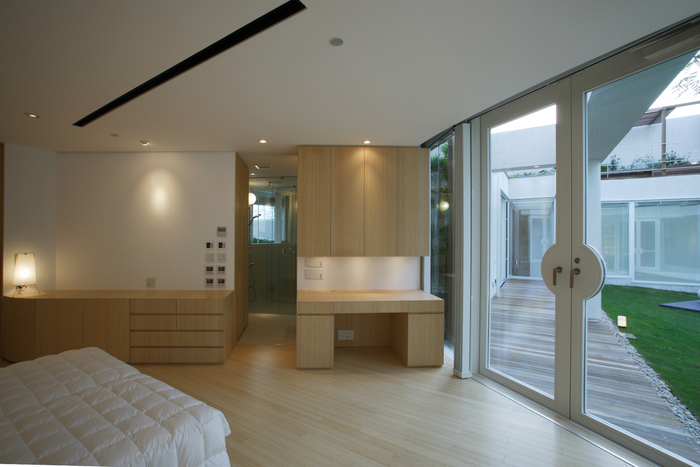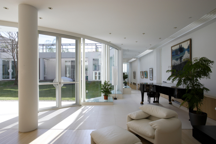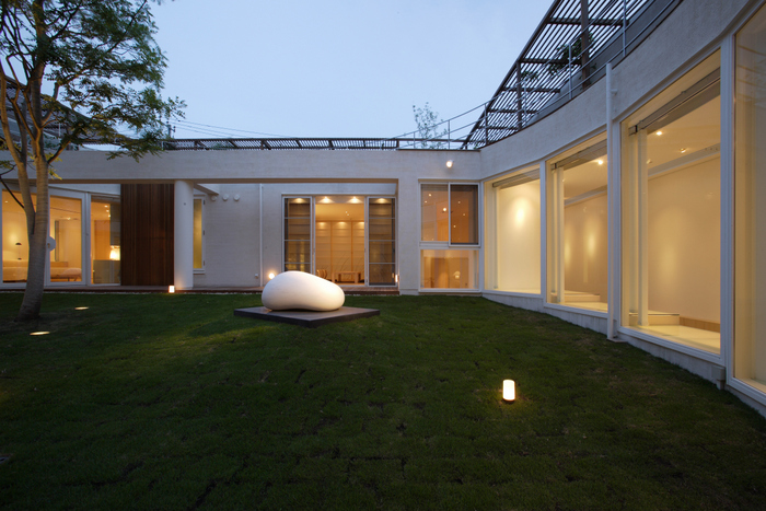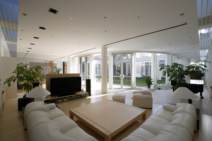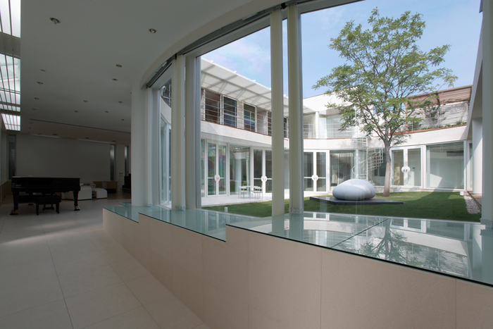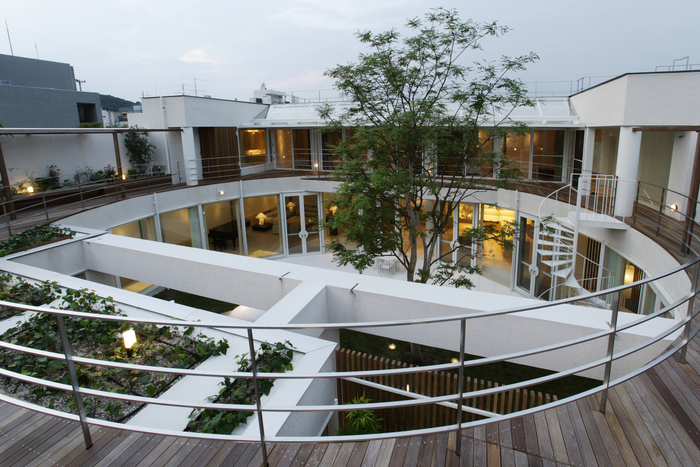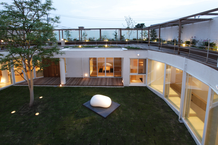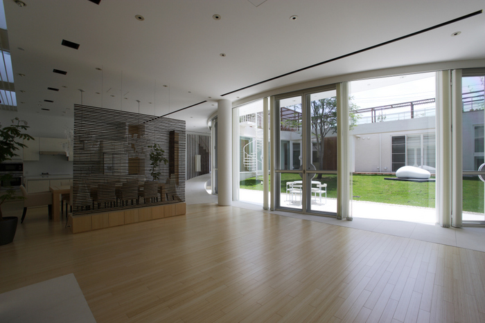 用途地域上周辺は近隣の家や商店が密集していることから、「外」にこの家を向けるのではなく、「インワード・ルッキング」にした。およそ235坪の敷地境界線ぎりぎりまで建物を接近させ、そのど真ん中に直径15m円形の中庭を設けた。すべての居室がこの中庭に向いていて緑、光、風をどの部屋にいても感じられる構造。外壁は外断熱の上に珪藻土を施し、室中の壁と天井のほどんどが漆喰塗装、そして床はライムストーンまたは竹のフローリングの自然材を用いている。