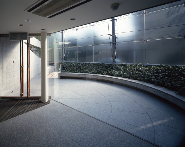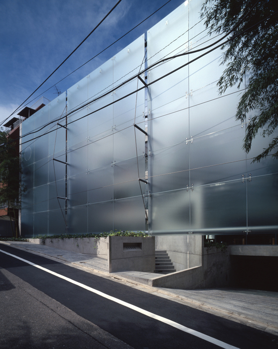 東京でのオフィス空間を共有するエグゼクティブのためのメンバーズクラブ。住宅街のなかに、メンバーだけのエクスクルーシブで、静謐な独立空間を構築する。特別な空間を創出するために、建物前面のフロストガラスで周辺環境とのカットアウトを図る。傾斜を利用した階段を降り、フロストガラスのスクリーンをくぐってさらに階段を上がり、玄関の中に入るアプローチを設けた。茶室のにじり口から入るごとく内部空間に入るとそこに外部とは全く別の世界が存在する。フロストガラススクリーンで周辺環境からの隔離、茶室の障子を通した光と風のあるミクロコスモができる。